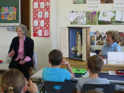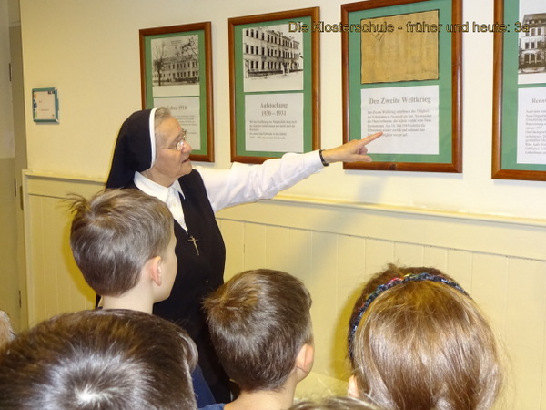 Schwester Thekla besuchte am 24.02.2016 die 3a. Sie erzählte den Schülerinnen und Schülern von der Ordensgründerin, der Schulstifterin und dem Leben früher hier im Kloste. Anschließend machten die Kinder mit Schwester Thekla einen Rundgang durchs Schulgebäude. Dabei erklärte sie den Kindern, wie das Haus früher ausgesehen hat. Anhand der Bilderwand konnten die Mädchen und Buben die Entwicklung der Klosterschule verfolgen. Viele interessante Fragen der Kinder beantwortete Schwester Thekla mit großer Freude! Die Schülerinnen und Schüler waren sehr eifrig und konzentriert bei der Sache.
